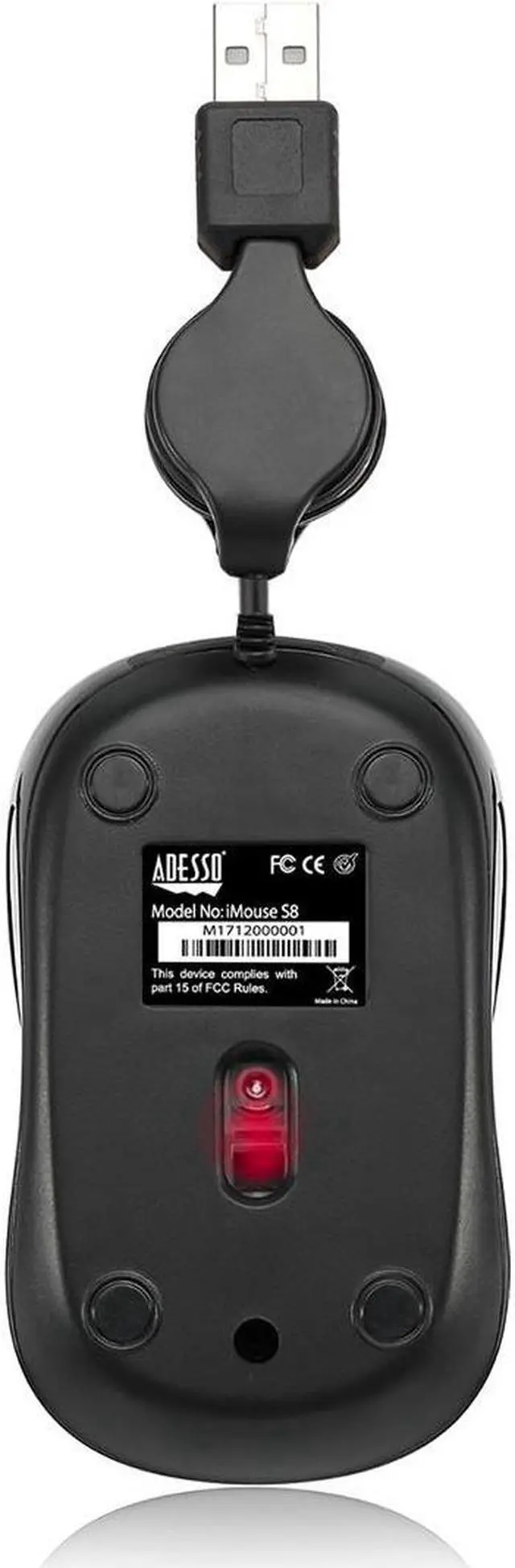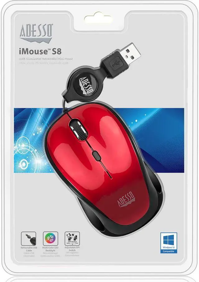 The Adesso iMouse S8 - USB Illuminated Retractable Mini Mouse is the perfect travel companion while on the road, and the perfect desktop mouse when you return. Our innovative design features a built-in scroll wheel to enable you to scroll up or down with pinpoint accuracy and control. A Retractable USB Cable allows you to expand and collapse the cable for improved mobility. Its built-in DPI of 800/1200 and optical sensor lets you navigate your cursor with better speed, accuracy, and reliability on almost all surfaces.