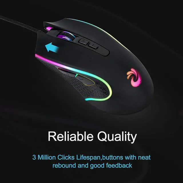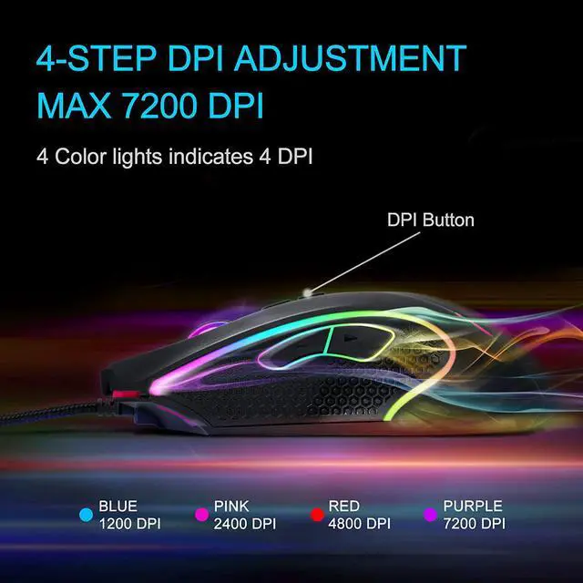 High-precision ClickWired mouse up to 7200 DPI (user adjustable 1200/2400/4800/7200 DPI). With two buttons on top of the computer mouse, you can adjust the dpi easily to get high accuracy and consistent responsiveness at any speed.