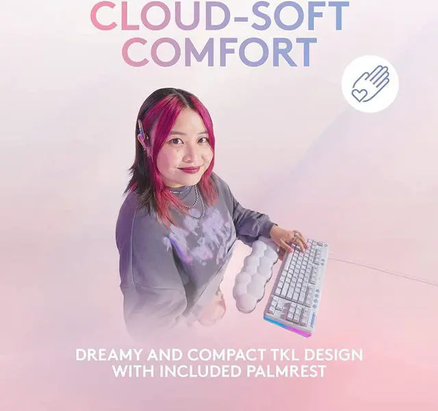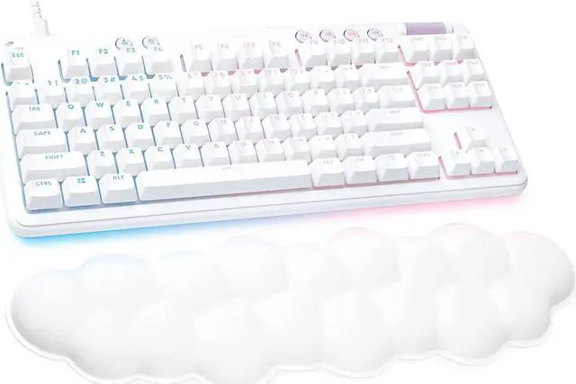 Cloud-soft Comfort: Float away with G713â??s dreamy white design and comfy, cloud-shaped palm rest; compact mechanical TKL keyboard layout and adjustable height give that good game feeling, all-day long