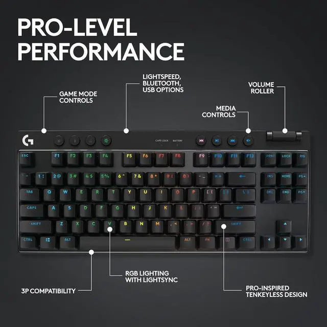 PRO-Grade Tech: Game mode control, standard keyboard layouts for 3P compatibility, media controls and volume roller, RGB lighting with LIGHTSYNC, and LIGHTSPEED, Bluetooth and USB options