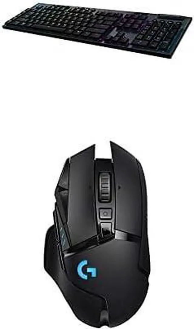 G915 keyboard features low profile GL Linear mechanical switches offering speed and accuracy. G502 mouse uses HERO 25K sensor for precise tracking.