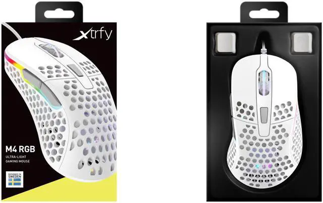 RGB Illumination: With customizable lighting, it's easy to add your own personal touch to the M4. Choose your colour, switch between numerous LED effects and adjust the brightness or turn illumination off completely. The RGB runs around the front of the mouse up both flanks, as well as on the scroll wheel and the XTRFY logo which is subtly visible through the holes on the palm rest for non obtrusive branding Ultra-Light is even lighter with the