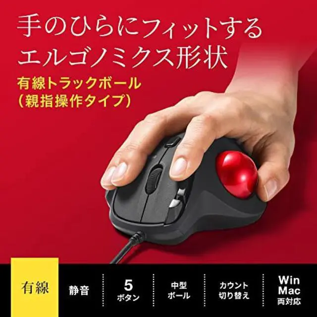 ship from Japan^^A trackball that allows you to roll the ball with your finger to operate the cursor. ^^It is a thumb-operated type that can be used in a relaxed state without straining. ^^It has an ergonomic shape that fits lightly with the palm of your hand. ^^It uses a 34mm medium-sized ball that is just right for moving with your thumb. ^^Comes with a back/forward button that allows you to quickly perform "back" and "forward" operations on a web browser, etc. *Cannot be used with the Apple Mac series.