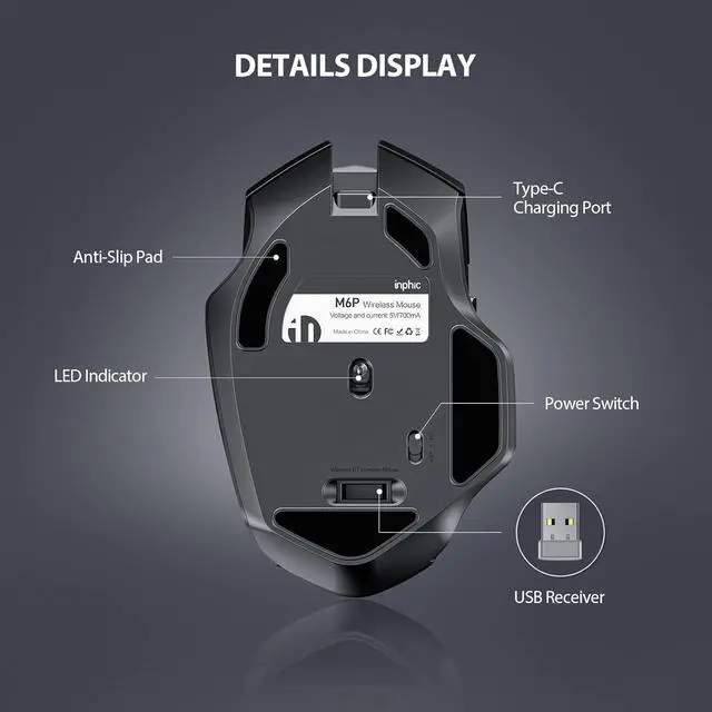 (UPGRADE FUNCTION) RECHARGEABLE & POWER INDICATOR - Built-in 700mAh large-capacity rechargeable Lithium polymer battery, which can be used for several months after a single charge. This wireless computer mouse is equipped with 3 power indicator lights, and the innovative design can clearly display the power source, saying goodbye to power failure