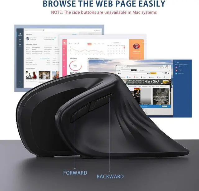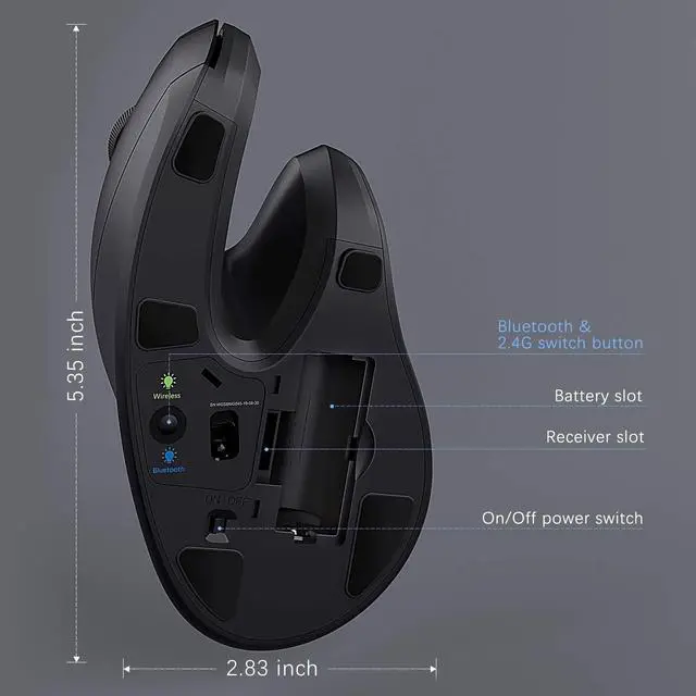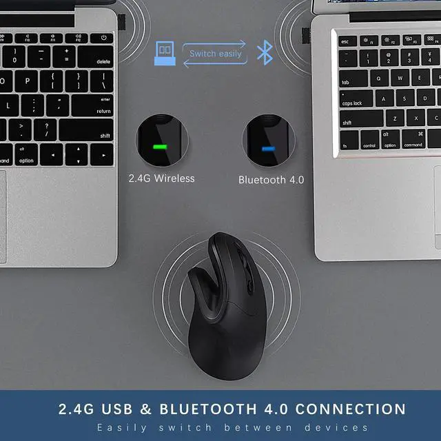 Bluetooth & 2.4G wireless connectionBT 4.0 and 2.4G dual connection mode (USB receiver is located at the bottom of the mouse), this vertical mouse can connect 2 devices at the same time and switch freely with one click.