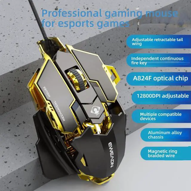 Professional Gaming Mouse, 12800 DPI Optical Sensor, RGB Lighting, Aluminum Chassis, Golden Gray, with Macro Programming and Retractable Wing