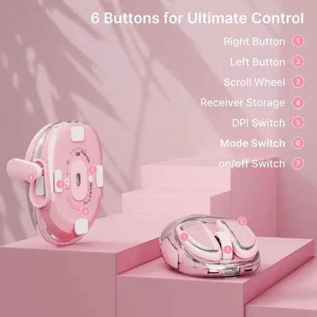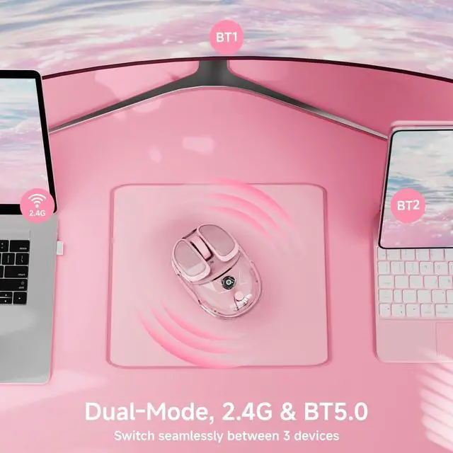 Dual Mode Connectivity: Seamlessly switch between Bluetooth (dual channels) and 2.4G wireless modes-The bottom pink mouse button can switch the connection mode. The cute computer mouse wireless is compatible with laptops, PCs, MacBooks, and iPads, offering flexibility for multi-device setups. Simply toggle the switch and pair effortlessly