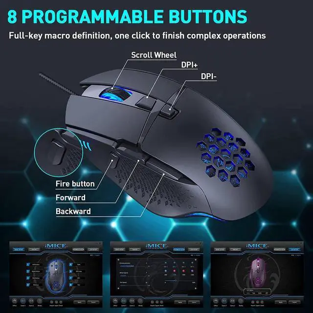 Customizable mouse with 4-color breathing light design, equipped with 8 programmable buttons and 4 adjustable DPI speeds up to 7200, you can control the speed more freely and easily. It provides you with a cool gaming environment while meeting your needs for advanced operation.