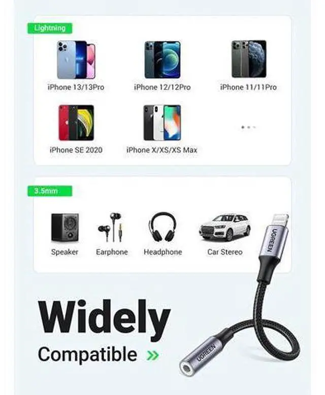 Apple MFI Certified: UGREEN Lightning to 3.5 mm headphone jack adapter can easily connect existing 3.5 mm headset to iPhone 13/13 Mini/13 Pro/13 Pro Max/12/12 Pro/11/11 Pro/11 Pro Max/X/XR/XS/XS Max/8/7 for audio and mic without Lightning connector headphone.