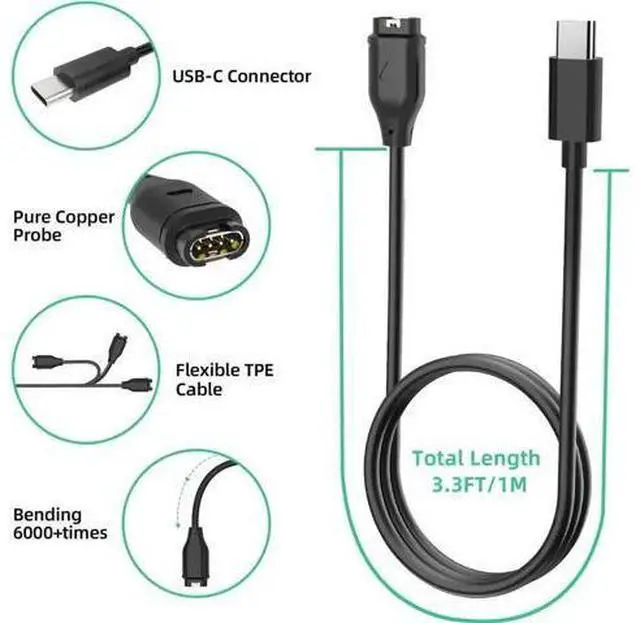 Features: Wide Compatibility -- USB C Charger Charging Cable Compatible with Garmin Fenix 7 7S 7X, Fenix 6 6S 6X, Fenix 5 5S 5X Plus, Vivosmart 5, Forerunner 45 45S 55 245 255 745 935 945 955 965, Approach G12 S10 S12 S40 S42 S60 X10, Vivoactive 3 Music 4 4S, Vivomove 3 3S Style Luxe Sport, Vivosport, Venu 2 plus 2S Sq Music Edition, Instinct Tactical Esports Edition, Instinct Tactical Impact Edition, Instinct Solar Camo Edition... Durable and Premium -- Made of high-quality TPE material and copper wire, it is resistant to high temperatures and has good elasticity, ensuring the quality of the Garmin watch charger charging cable Safe Charging -- with multiple protections for over-voltage, over-current, short-circuit, and temperature, it provides a safe charging environment and gives you a pleasant charging experience Compact and Portable -- Its design is lightweight and compact, making it convenient for you to carry around What You Get -- 2 Packs USB C Garmin watch charger cables.