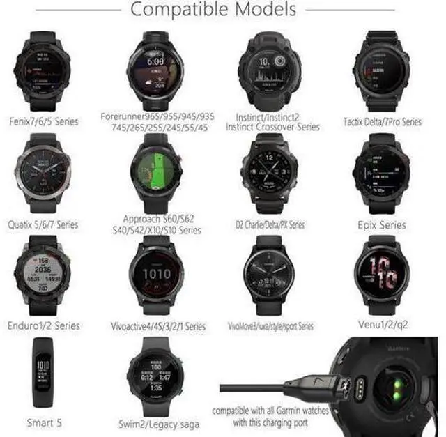 Compatibility: -Compatible with Garmin Fenix 5 5S 5X -Compatible with Garmin Fenix 6 6S 6X -Compatible with Garmin Fenix 7 7S 7X -Compatible with Garmin Smart 5 -Compatible with Garmin Enduro / Enduro DLC -Compatible with BarkLimiter 2 / BarkLimiter 2VT -Compatible with Striker Cast / Striker Cast GPS -Compatible with Garmin Forerunner 45 45S 55 245 255 745 935 945 955 965 -Compatible with D2 Air /D2 Charlie / D2 Delta / D2 Delta PX / D2 Delta S -Compatible with Quatix 5, 5 Sapphire /Quatix 6, 6 Titanium / Quatix 6X Solar -Compatible with Garmin Venu / Venu Sq / Venu Sq Music Edition / Venu 2 / Venu 2 Plus / Venu 2S -Compatible with Captain Marvel / Rey / Garmin Swim 2 / Impact Bat Swing Sensor / First Avenger / Darth Vader -Compatible with Garmin Tactix Charlie / Tactix Delta Sapphire Edition / Tactix Delta Solar Edition / Tactix Delta Solar Edition with Ballistics -Compatible with Garmin Vivoactive 3, 3 Music / Vivoactive 4, 4S / Vivomove 3, 3S / Vivomove Style / Vivomove Luxe / Vivomove Sport / Vivosport -Compatible with Garmin Approach G12 / Approach S10/ Approach S12/ Approach S40/ Approach S42/ Approach S60/ Approach S62/ Approach X10 -Compatible with Garmin Instinct /Instinct Esports Edition / Instinct Tactical Edition / Instinct Solar / Instinct Solar Camo Edition / Instinct Solar Surf Edition/Instinct Solar Tactical