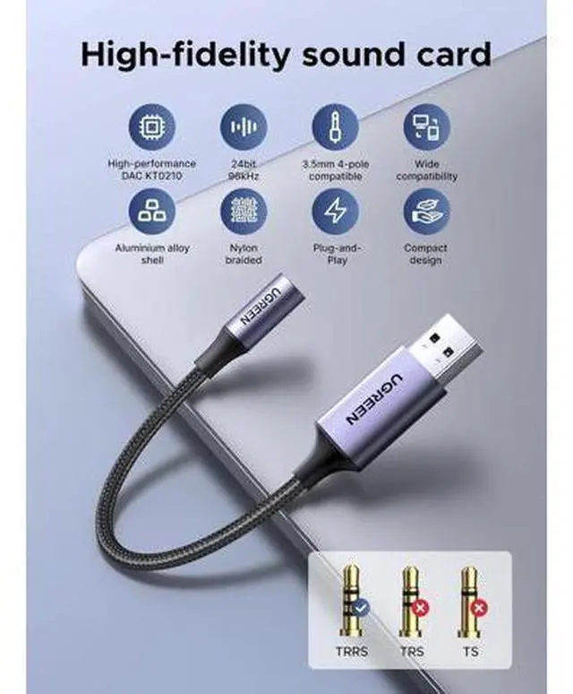 • 2 in 1 USB Audio Adapter: UGREEN USB to 3.5mm jack audio adapter supports both listening and talking. In-line control and microphone function allows you to chat while gaming. This USB Aux adapter enables you to connect headphones, headset, speakers with 3.5mm jack to your PC through the USB A port. [*Note: The 3.5mm adapter can support the connection of a single microphone for use. Please note that the 3.5mm male microphone's attribute requirement is TRRS]