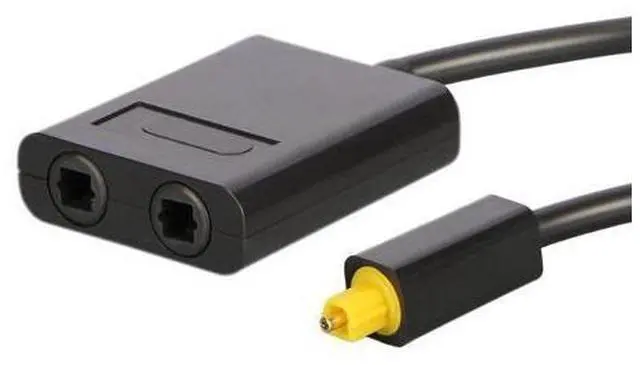 Player USB Type: Standard 2port Toslink Digital Optical Audio Splitter Adapter Fiber Optic Audio Cable 1 In 2 Out 10cm, black color It allows you to connect one toslink optical digital audio source and split into two different receiving devices such as a A/V receiver and a television; Ideal for connecting your CD player, DVD player, or other digital audio source to both of your receiver and recorder; 24k Gold Connectors, 1mm low-loss core, low-jitter synthetic fiber and heavy metal connectors to dampen vibration, giving you the ultimate listening experience; Digital optical One divides into two Splitter for CD/DVD PS3 X-Box360 Computer.
