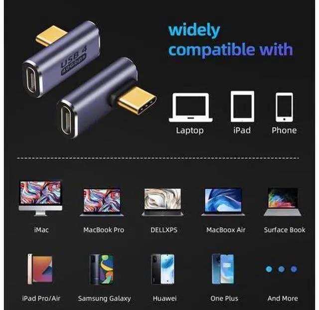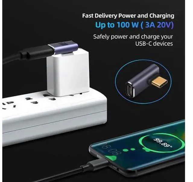 [90 degree right angle data transmission] this 90 degree adapter allows the cable to have a suitable extension direction which can avoid the wear of the cable and the input port of the device prolong the service life and support charging and data transmission. [High speed charging and data transmission] The USB C adapter can realize the maximum 5V/3A-20V/5A 100W USB power delivery providing your device with the fastest possible charging. Provides data transmission speeds up to 40 Gbps. [8K Video Output]The USB C adapter support 4K@60Hz even 8K video output. You can enjoy charging audio video and transfer data on the trip at home and in the office.