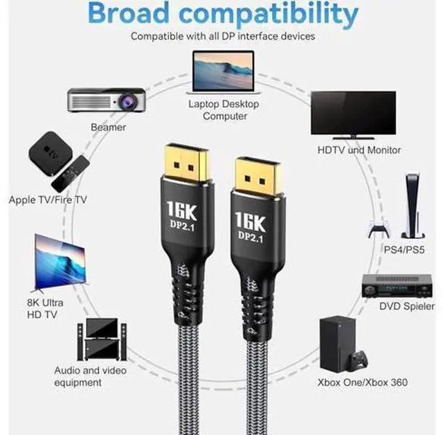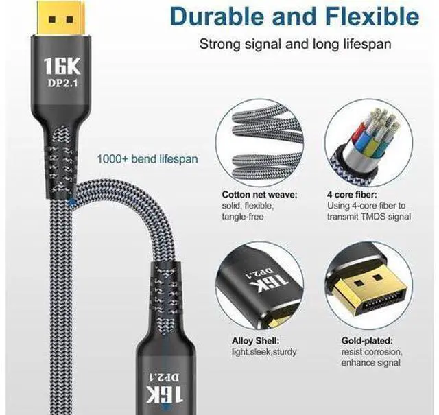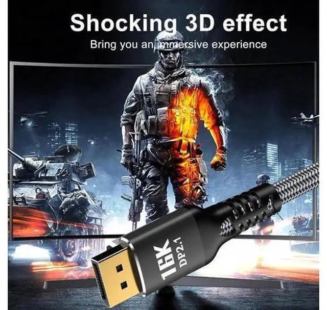 • 4K@240Hz Flicker-free Gaming Experience: 16k displayport cable 2.1 supports 16K@30Hz, 10K@60Hz, 8K@60Hz/120Hz, 5K@60Hz, 4K@240Hz / 165HZ / 144Hz / 120Hz / 60Hz, 2K@360Hz / 240Hz / 165Hz / 144Hz. Support for Display Stream Compression(DSC), Forward Error Correction and HDR meta transport. No motion blur, screen tearing or flickering. It is perfect for the latest massive FPS games and 3A masterpieces or MOBA games.