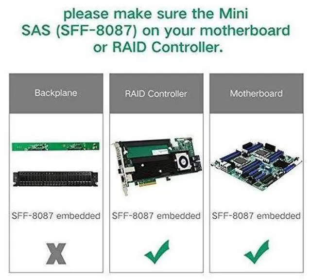 Important Notes: If the Mini SAS (SFF-8087) is on your backplane, this cable will not work with them. Please make sure it's Mini SAS port (SFF-8087) on your motherboard or RAID Controller.
