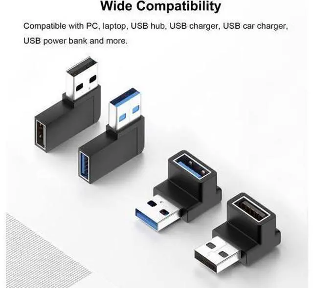 90 Degree Angle DesignThe vertical up and down angle horizontal left and right angle adapter can change the direction of the USB interface by 90 degrees to any angle effectively protect the USB interface of the device and support fast charging and data transmission. 5Gbps Fast Data TransferThe adapter support USB 3.0 transmission and downward compatibility with USB 2.0 The data transfer speed up to 5Gbps and can quickly transfer high-definition video music pictures and other files. Plug and PlayCompact and durable it can be plugged and unplugged for up to 10000 times and it does not need to install any driver plug and play.