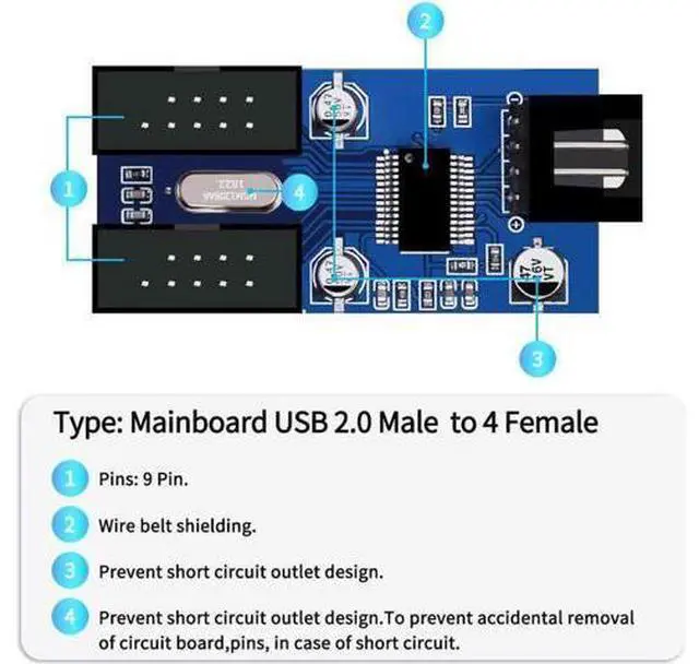 Type: Mainboard USB 2.0 Male 1 to 4 Female? Cable Length(approx. ): 30cm? Wire belt shielding? Prevent short circuit outlet design? To prevent accidental removal of circuit board, pins and case the risk of short circuit? Easy to