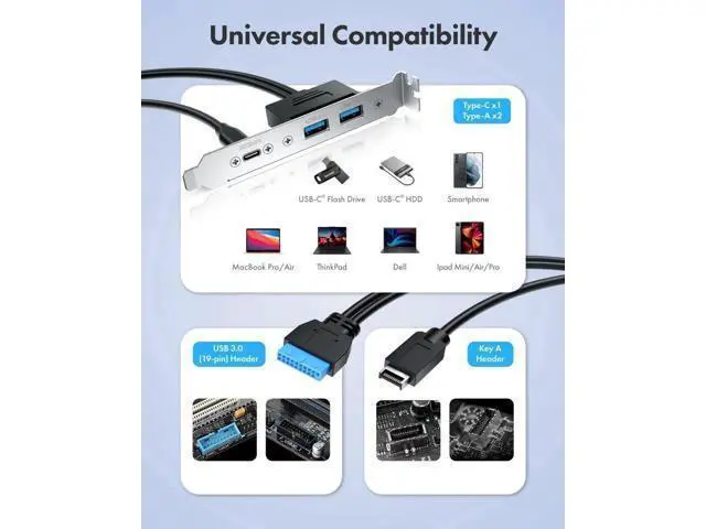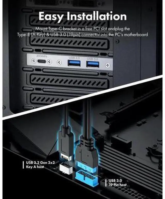 Quickly adds ports through available Type-E and USB 3.0 slot on motherboard for connecting a variety of external USB devices. Fully plug and play and no driver required (Make sure that your motherboard have both headers before buying, some old motherboards do not have 20-pin USB 3.2 Key-A Type-E header and would suggest to install with an USB Front Panel Adapter which converts USB 3.0 header into a USB 3.2 Type-E Key-A 20-Pin connector or a Type-E PCIe Card which converts PCIe slot into a USB 3.2 Type-E connector) Stability and SafetySturdy metal construction ensures a long service life and durability, and fully double shielded EMI/EFI wires to prevent noise interference internally and externally Package ContentsUSB Type-E to Type-C and Type-A extension cable with PCI bracket USB 3.2 Gen 2x2 Type-C and USB 3.0 Front Panel Header Extension Cable with PCI Bracket extension cable is designed to provide your an easy way to convert the motherboard's USB 3.2 TYPE-E and USB 3.0 interface to USB-C and USB Type-A ports on the back of the computer case.