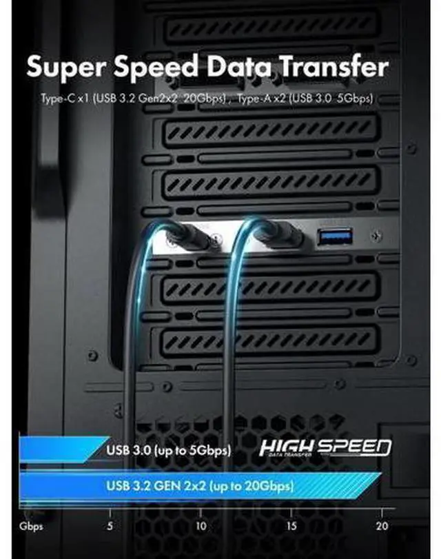 About this item 20Gbps High SpeedConstructed with extremely high speed wires that supports USB-C USB 3.2 Gen 2x2 20Gbps / USB 3.0 Type-A 5Gbps, also backward-compatible with USB 2.0 (The Type-c standard cable is inherently able to operate at both USB Type-C Gen 2 10Gbps and Gen 2x2 20Gbps speeds. The 20Gbps specialized port is required on the device to meet the full 20Gbps transfer speed) Wide CompatibilityPanel-mounted USB-C and USB female connector enables you to connect all USB ready devices such as phones, tablets, flash drives, mouse, hubs, and other USB-C peripherals ConvenienceEasy installation and huge expansion for your PC casing.