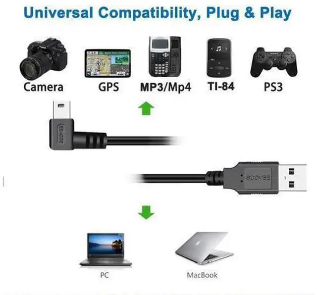 Universal Compatibility: SCOVEE 90 Degree Mini USB cord is compatiable with Garmin Nuvi mini-b cable for Canon PowerShot ELPH 180 190 300 XS400 300 HS A1400 SD600 G7X SX400is etc Rebel T3 T6 T6i T7i SL1 etc and other devices like Dash Cam MP3 Players SatNav Camcorders with Mini 5 Pin connector? PLUG and