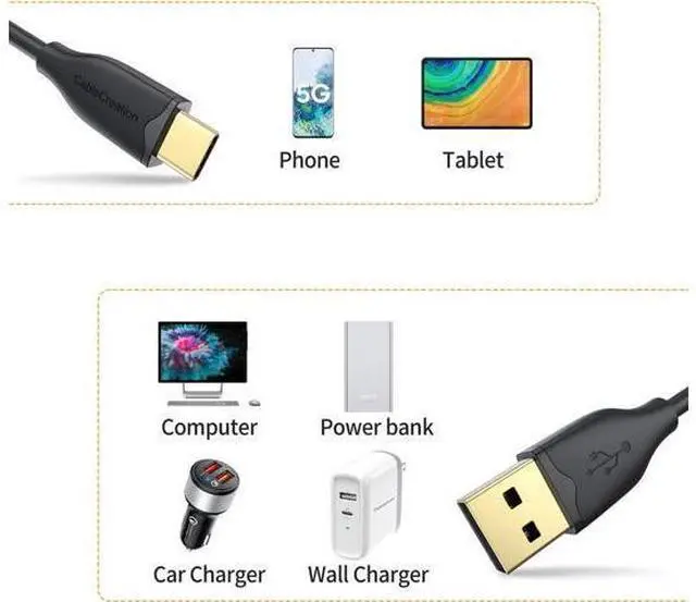 3A Fast Charging & Data SyncOutput power up to 3 Amp, support QC quick charge, ensured by high-speed safe charging. This usb c to usb cable supports data transfer USB 2.0 speed up to 480Mbps(=60MBps). Please Note!!! we don't recommend to connect this cable to hard drives for large file transfer, in this case you need a 5G/10G usb-c cable, ASIN: B013G4CHDE/ B072M7GH29 for your reference. 56K Pull-up Resistor for Safe ChargeCableCreation USB C to USB A Cable is built in with a 56k ohm resistor, which esures a safe charging and protect your devices and charging adapters from damage of overcurrent. Soft & Flexible PVC JacketCableCreation usb to usb c cable covered with PVC molded jacket, softer and more flexible than most usb c cables in the market. Besides, this usb c to a cable can bear 30000+ bending test, more durable for long life usage. USB Type C Compatible with iPad Pro 2018, Macbook Pro, Chromebook Pixel, Moto Z8, Moto Z Droid/ Z Force, Galaxy S20/ S20+/ S20 Ultra/ S10/ S10+/ S10e/ S9/ S9+/ S8/ S8+, OnePlus 2, Google Pixel 3/ 3XL/ 2/ 2XL/ XL, ASUS ZenPad S 8.0, Lenovo Zuk Z1, HP Pavilion X2, HTC 10 /Bolt, P20/ P20 Pro/ P30/ P30 Pro, Mate 20 10 Pro, GoPro Hero 8, Hero 7, Hero 6, Hero 5 & new devices with USB-C port. 24 Months Replacement WarrantyCableCreation offers all customers with 24-month product warranty and lifetime technical support.