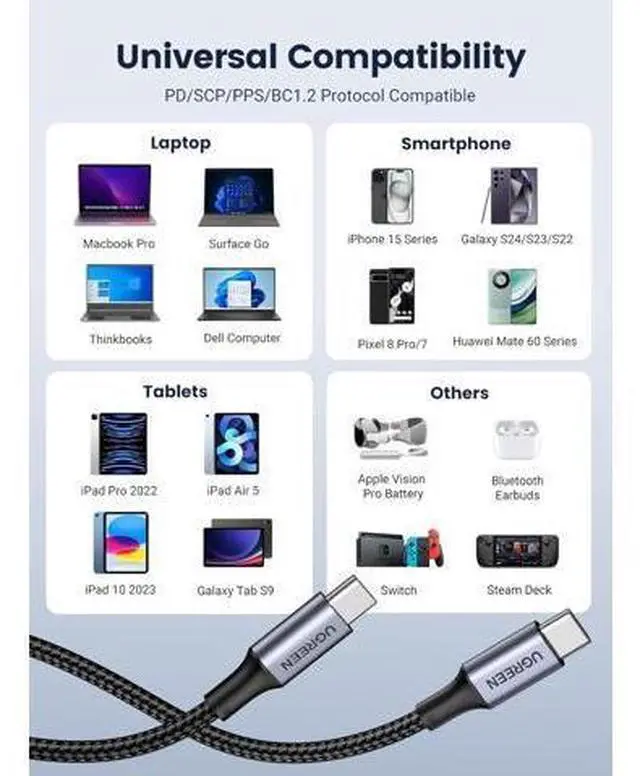 Broad Device Compatibility: The USB C to USB C cable is widely compatible with USB-C devices, laptops like 2022 MacBook Pro, cellphones including iPhone 15 Series, Samsung S24/S23, Google Pixel, LG, tablets like iPad Pro and more