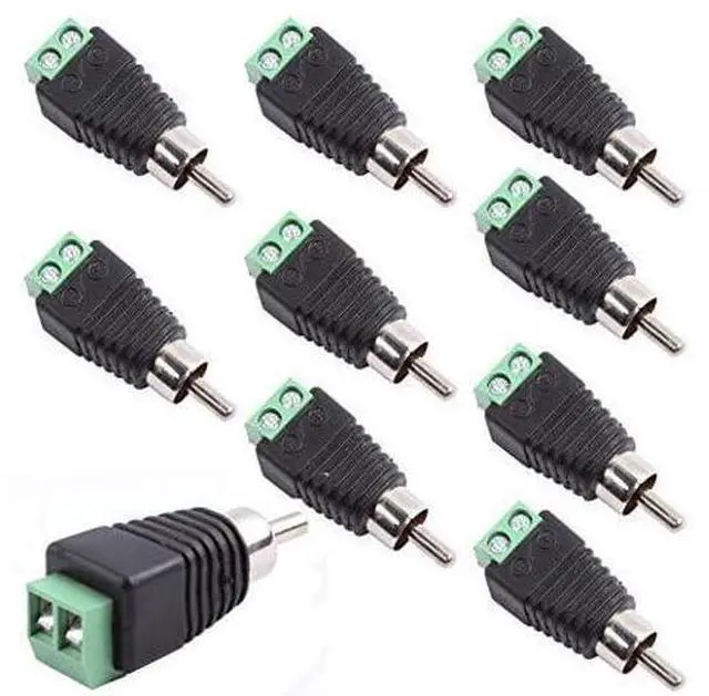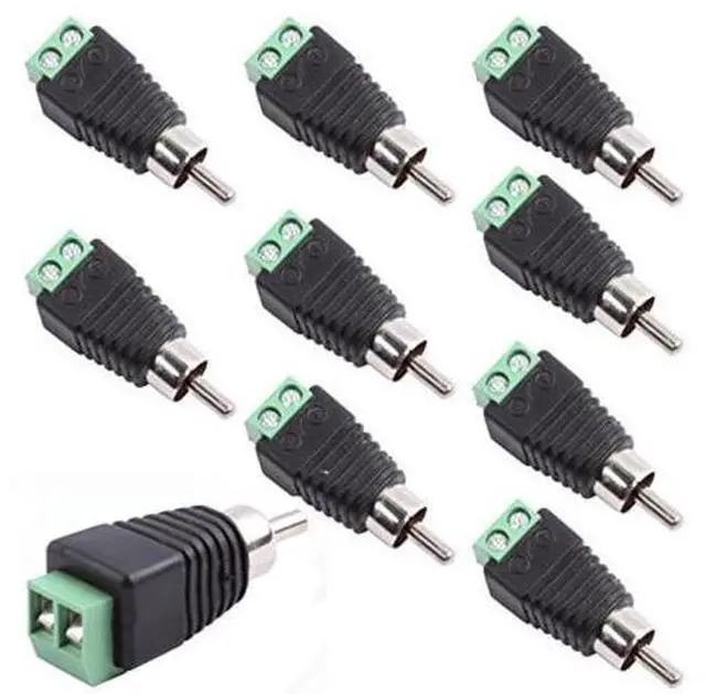 RCA Plugs is professional for CCTV installers and excellent for all DC cameras PartNo electrical tap no splicing no crimping but only a small screw driverRCA to speaker wire adapter is easier for CCTV microphone or camera installation save time and more securerPhono RCA Plug TO AV Screw Terminal Plug Connector CCTV Video AV BalunPackage Contents: 10Pcs Male RCA Plug to AV Screw Terminal. Lifetime Warranty.