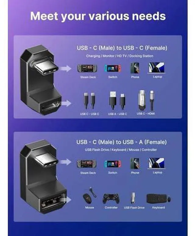 (Note: Please make sure both your input device and output monitor have usb type c port and support video input and output). CompatibilityWidely work with most Type C devices. For Steam Deck, Switch, MacBook Pro, Surface Book 2, Samsung Galaxy S22/S21/S20/S10, Note 20/10, LG G7/V20, Google Pixel, ChromeBook, etc. What you getUSB C Male to USB C Female Adapter * 1, USB C Male to USB A Female Adapter * 1, 18 months warranty and and 24/7 customer service, if you have any questions, we will resolve your issue within 24 hours.