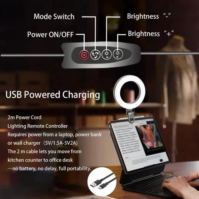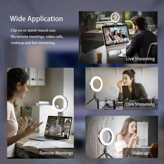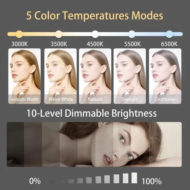 6" Ring Light + 5-Color 10-Level PrecisionA 1.6" ultra-thin head packed with 72 LEDs outputs Warm, Warm-White, Natural, Daylight & Cool tones (3000-6500K) and 0-100% stepless dimmingperfect for computer illumination or soft, glare-free makeup light on your desk.