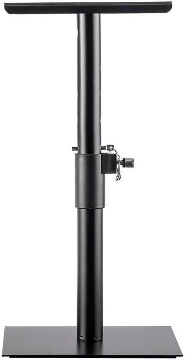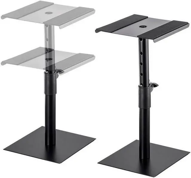 Made of steel, Stage Right desktop monitor stands are height adjustable, allowing you to place your monitors between 12" and 18" above the height of your desk. The base is 9" x 10" and the top platform is 9" x 9", providing sufficient surface area to support monitors up to 8" in size. For additional stability, Stage Right desktop monitor stands include antislip pads and can support up to 22 lbs.
