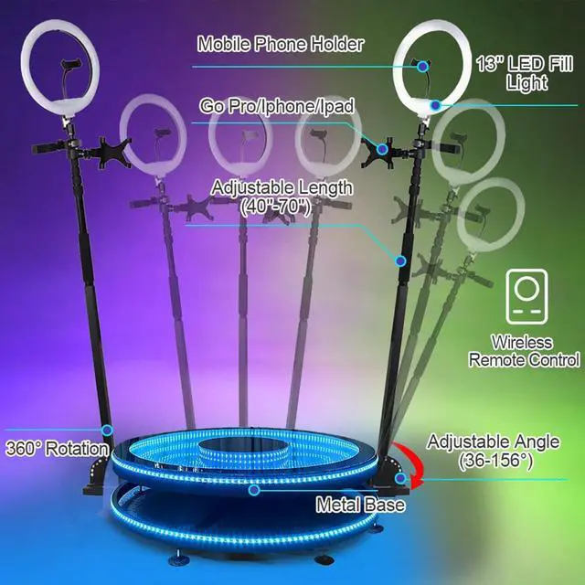 SUPPORT: Devices for smart phone, Pad, Go Pro and DSLR camera. Platform diameter in 115cm/45.2 and can accommodate 4-5 people.