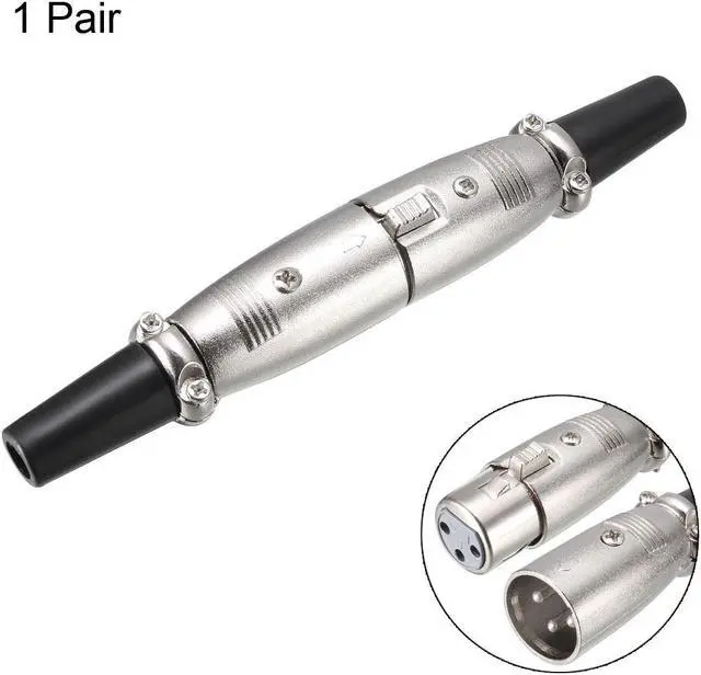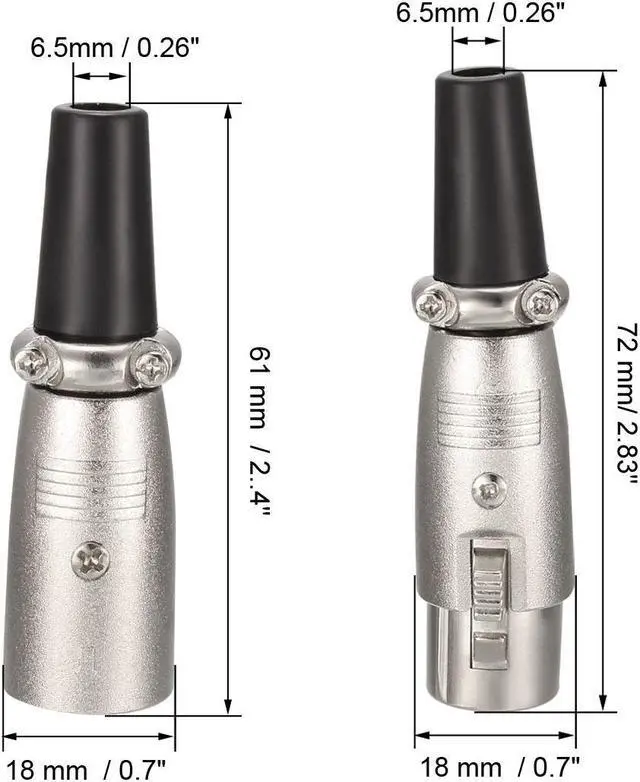 Female Total Size: 72 mm x 18 mm KEY_TAB / 2.83" x 0.7" KEY_TAB (L * D)Package Included:1pair x XLR Male /Female Connector ( 1 Male / 1 Female)KEY_TAB Description:1. XLR Male /Female Connector has Standard 3 pin Hole configurations suits professional audio equipment with XLR outputs.2.Compact and convenient design, metal plug, good contacts, stable signal transmission, convenient and durable.3.Made of Zinc alloy, ensures high conductivity and durability. Rubber shell for smooth surface without burrs and the noise can be well shielded4.Can be applied on microphone connections/audio electronics, amplifiers and cabling applications.