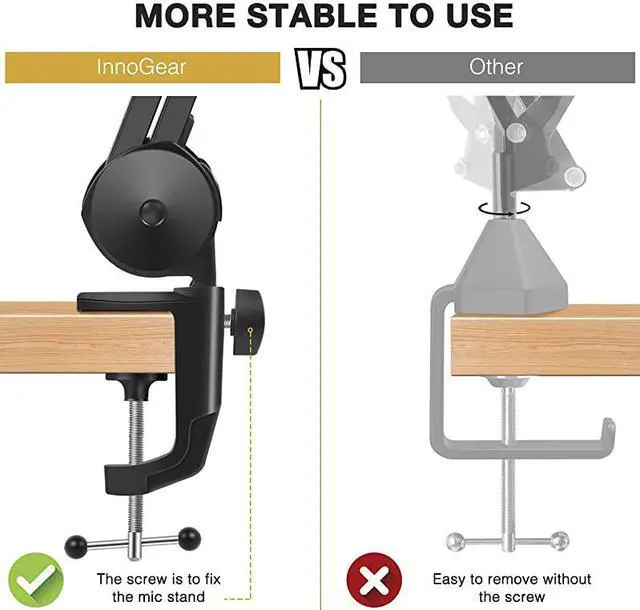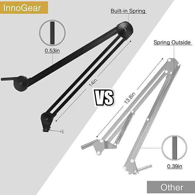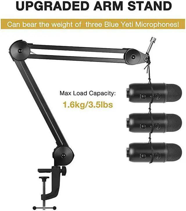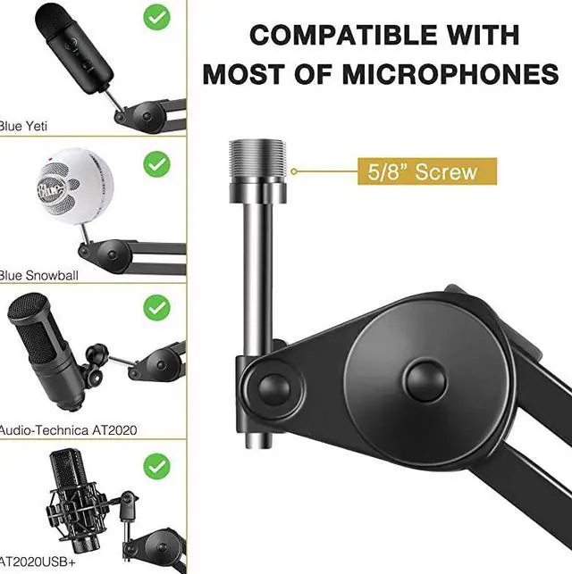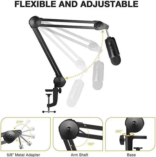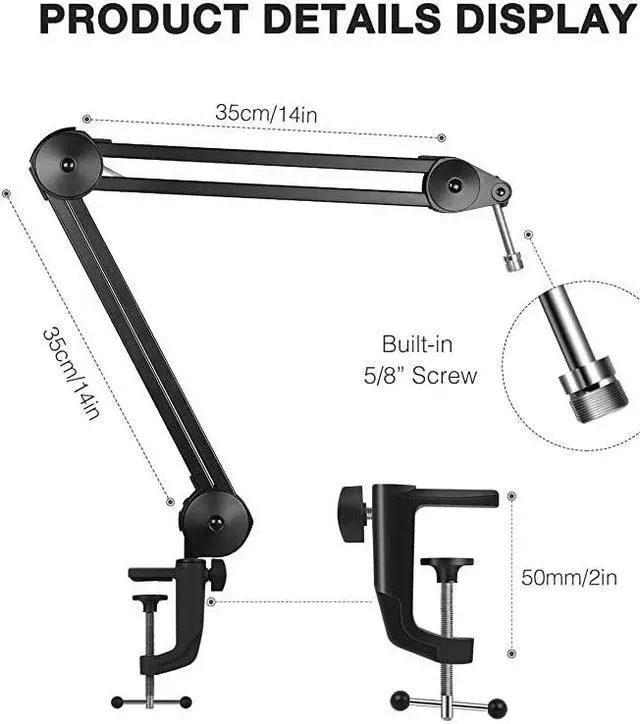 Material: Iron Package includes 1 x Spring Built-in Microphone Arm Stand 1 x Desk Mounting Clamp 5 x Cable Ties 1 x User Manual Note
