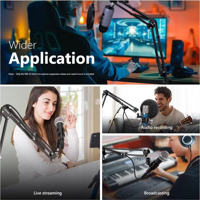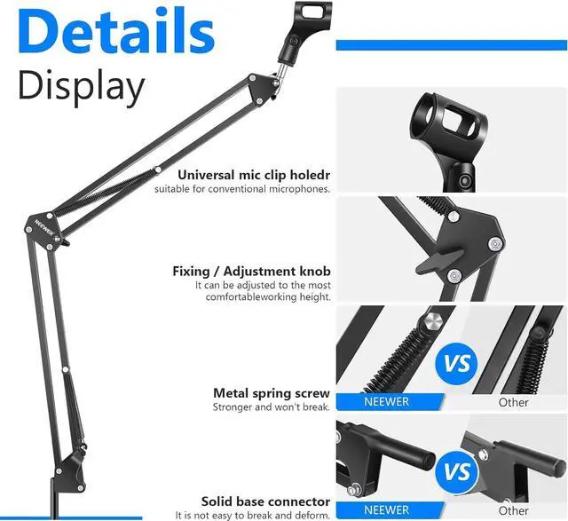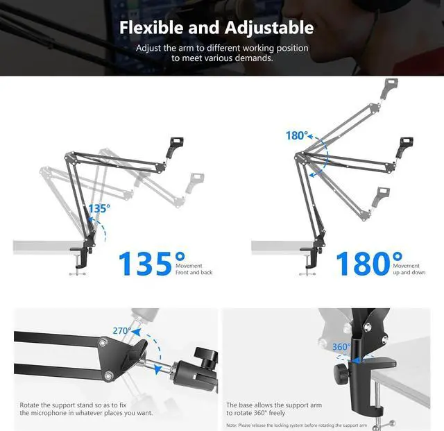 Adjustable Microphone Boom Arm Conveniently adjust the angle and height of this mic boom arm to suit your vocal recording needjust loosen the adjustment knob and adjust the boom arm. Its also easy to fold up and carry. Perfect for stage/studio recording, broadcasting, TV stations, and more