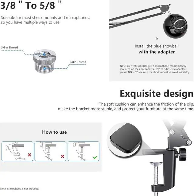 3/8 to 5/8 Screw Adapter & Mic Clip The 3/8 to 5/8 adapter allows you to mount a compatible microphone (like Blue Yeti or Blue Snowball) on the boom arm. Its not compatible with Blue Yeti Nano which has a 1/4 thread mount. The microphone clip mounts a microphone with a shaft diameter of 1.26 / 3.2 cm to the boom arm