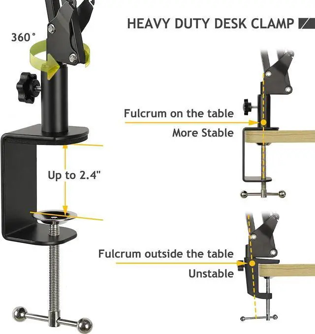 Upgraded Desk Clamp: Compared with other clamps, this metal desk clamp has anti-scratch pad and larger contact area for easily clip to any desk up to 2.4" /60mm thick.