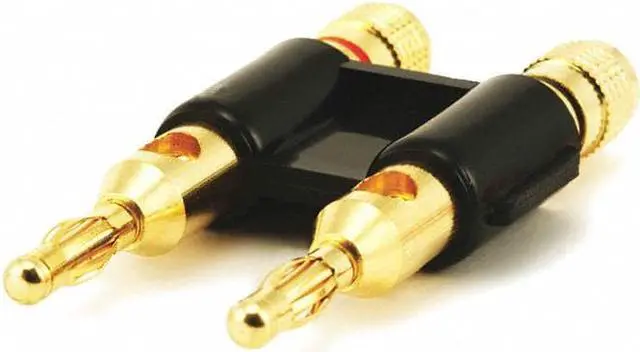 Banana plugs make speaker installation a breeze. They are designed for use with amplifiers or speakers that use traditional binding posts. Not only is it easier to make the connection on the back of your amp, it is safer, with no chance of stray wire strands creating a short across contacts. This high-quality dual plug has two banana plugs spaced 3/4" center-to-center with a black plastic yoke, the typical distance between binding posts on speakers. The plugs are the open screw type and can accept bare wire, spades, or other banana plugs.