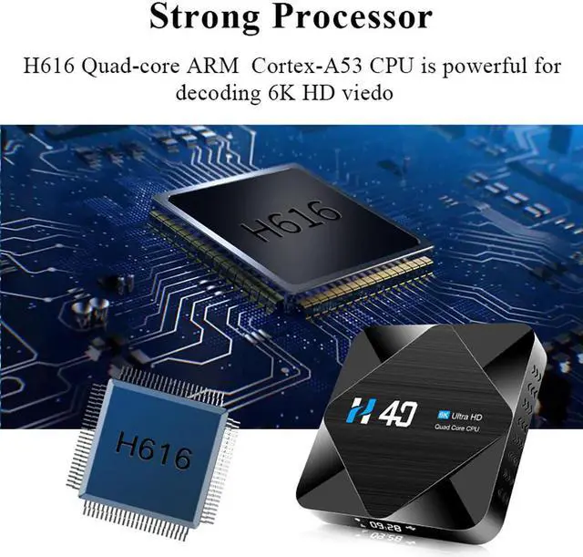 CPU: H616 Quad-core 64bits ARM Cortex-A53@ up to 1.5 GHz