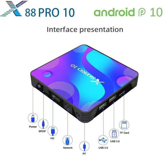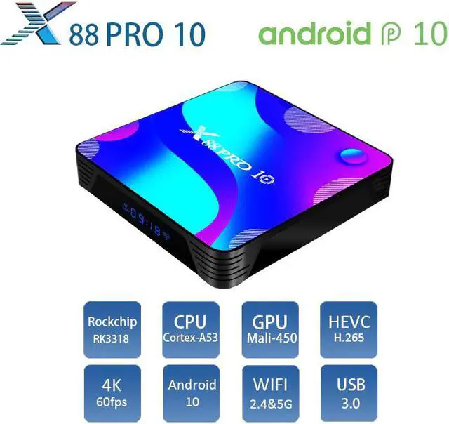 Important features of PRO 10 include Rockchip RK3318 Quad-Core 64bit Cortex-A53 CPU, Penta-Core Mali-450 GPU, 100M LAN, built-in 2.4&5G dual Wifi + AC, BT4.0, H.265 HEVC, 4K @ 60fps , HD 2.0, USB2.0 and 3.0.