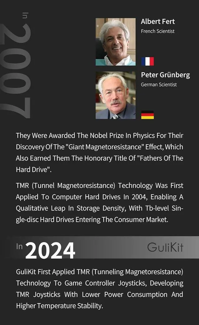 Upgraded Anti-Drift TMR Joystick Technology Evolved from GuliKit's patented Hall Effect joystick, the more advanced TMR (Tunnel Magnetoresistance) thumb stick same works with contact-less magnetic field sensing mechanism to eliminate stick drift cause,while offers ultra-low power consumption, enhanced stability, drift-free long lasting durability, high-precision and silk-like smoothness.