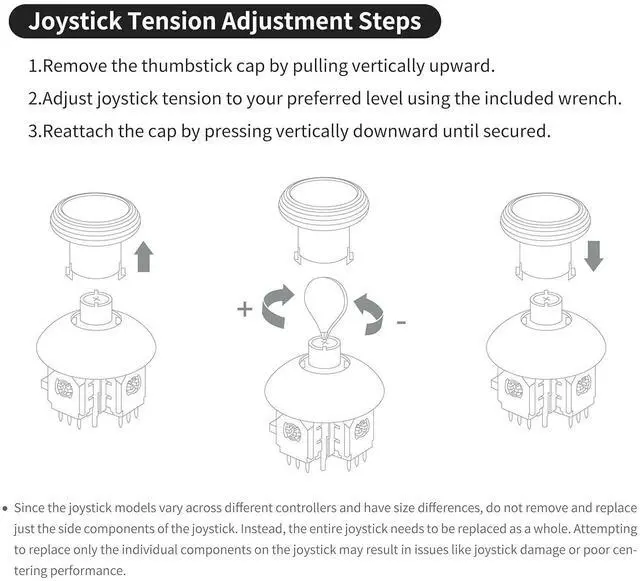 720° LEVEL-LESS ADJUSTABLE TENSION WITH TOOL:Our joysticks feature 720° (two full rotations)level-less tension adjustment, allowing you to customize the control force with ease. To set your preferred tension, simply remove the cap(pull vertically) and use the included wrench to adjust the tension by turning the screw marked with the + and - signs. The hidden tension mechanism under the cap can prevent accidental adjustments.