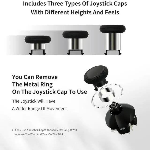 3 PAIRS OF JOYSTICK CAPS INCLUDED: Our joysticks kit provides 3 types of caps with different heights and feels for user. For both disassembly and assembly, you need to pull out or press down vertically along the groove. The metal ring on the joystick cap can be removed for a wider range of movement, which offers greater flexibility but may also increase wear and tear on the stick.