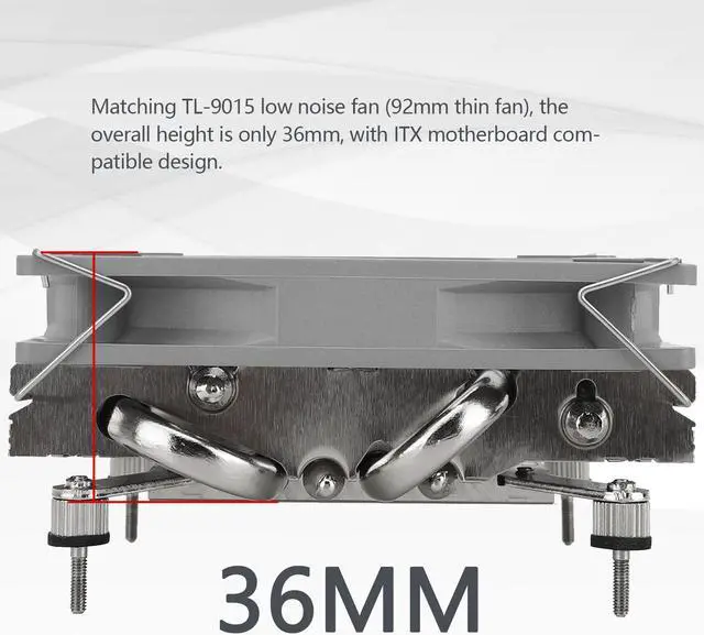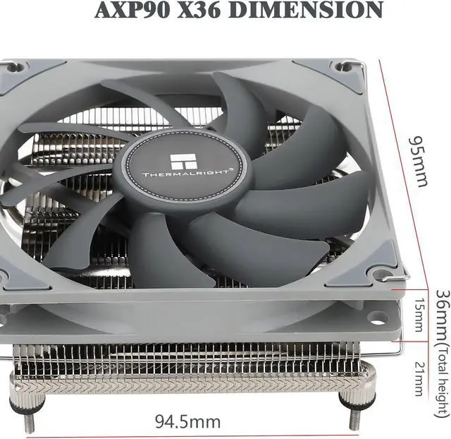 CPU Cooler dimensions: 94.5(L)x95(W)x36(H)mm;Compact underpressure cooler with secondary reflow process,fins in aluminium throughout,overall height of 36mm,designed for ITX motherboards.