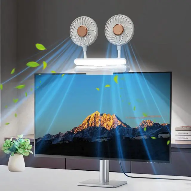 Clip On Monitor Fan with Light BarThis monitor fan is not only a fan, but also a lamp. With double heads, it's like having two tiny wind gods blowing a cool breeze while you work. The light bar ensures youre never working in the dark. Built-in LED white light design effectively reduces glare and reflection on the screen, thereby reducing eye fatigue.The lighting angle and brightness of the lights can be freely adjusted according to your needs, It has 3 adjustable brightness levels.