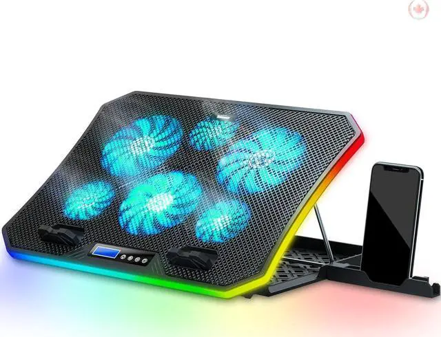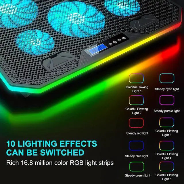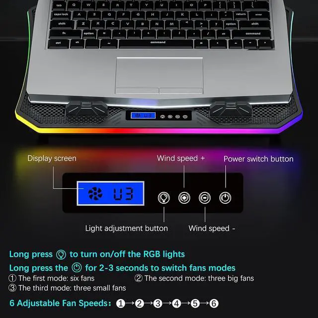 6 High Speed and Silent Fan The laptop cooling pad is composed of 3 small fans and 3 large fans. Provide strong wind to reduce the temperature of your laptop effectively. At the same time, the fans had added with capacitor components to reduce noise. There is almost no sound when the computer is placed on it. LCD display screen allows controlling 6 fan speed & fan modes and rgb lights.