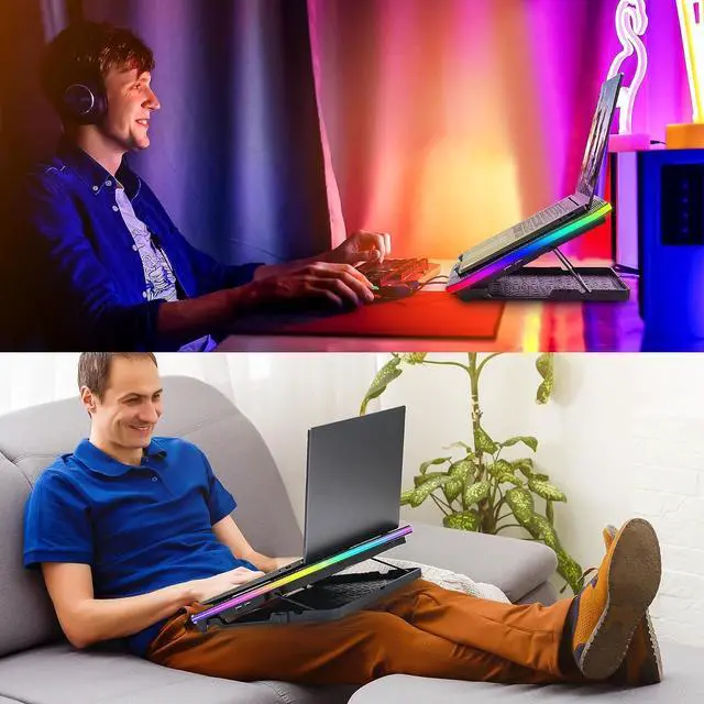 Broad CompatibilityThe computer cooling pad is compatible with 10 11 12 13 14 15 15.6 16 17 17.3 inch laptops. The two USB ports are reinforced and matched with the braided wire USB cable, which will not loose or fall off easily. The panel of the rgb laptop cooler is equipped with 2 non-slip baffles, which is suitable for large and heavy laptop.