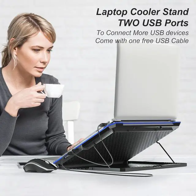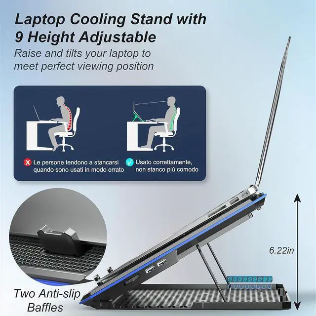 Adjustable Cooling Stand Height This laptop fan cooling pad with 9 stand height, raising your laptop 2.75" to 6.3" high, and helps to relieve neck pain caused by prolonged computer use and incorrect posture. Two Non-slip Baffle can prevent your laptop following down on slanting surface, which is suitable for large and heavy laptop.