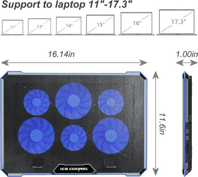 6 Super Cooling & Quiet FansICE COOREL cooling pad for laptop with six high-speed silent turbo blue fans, provides excellent cooling effect, 360 degrees all-round dynamic cooling; At the same time, this laptop cooling fans are all added with capacitor components to reduce working noise, very quiet and creates a noise-free environment for you! UPGRADE-This laptop fan with no lights(won't disturb your eyes), but you can see the blue fans moving and working.