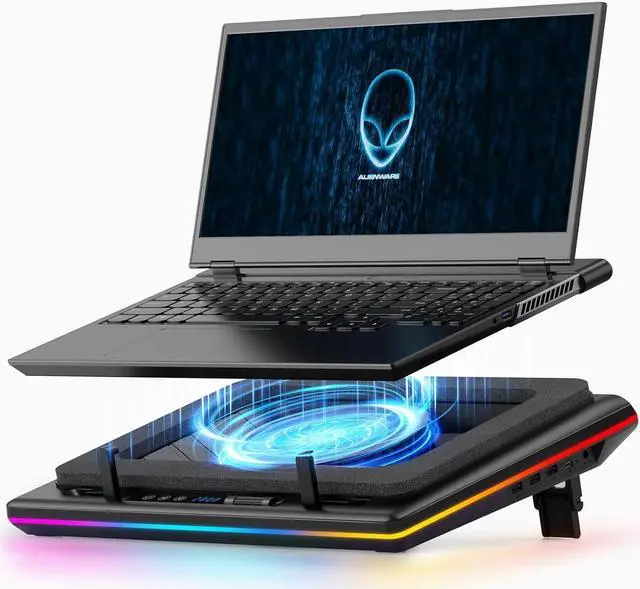 [Soothing Controllable RGB]RGB linght bar on the laptop cooling pad for PC, with 4 modes and more than 10 light colors collection, matches your PC gears accessories for amazing synergy even in dim room. You can control the RGB touch key for better game color scheme. Configured memory function, the laptop cooler RGB eliminates repeated selections and brings itself alive when power on